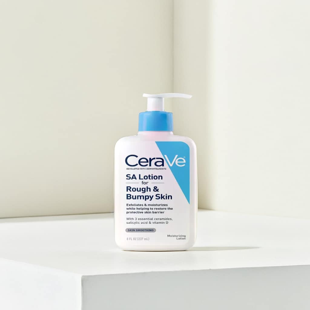 La lotion Cérave SA exfolie et hydrate en douceur les peaux rugueuses et avec des boutons, tout en aidant à restaurer la barrière protectrice de la peau.