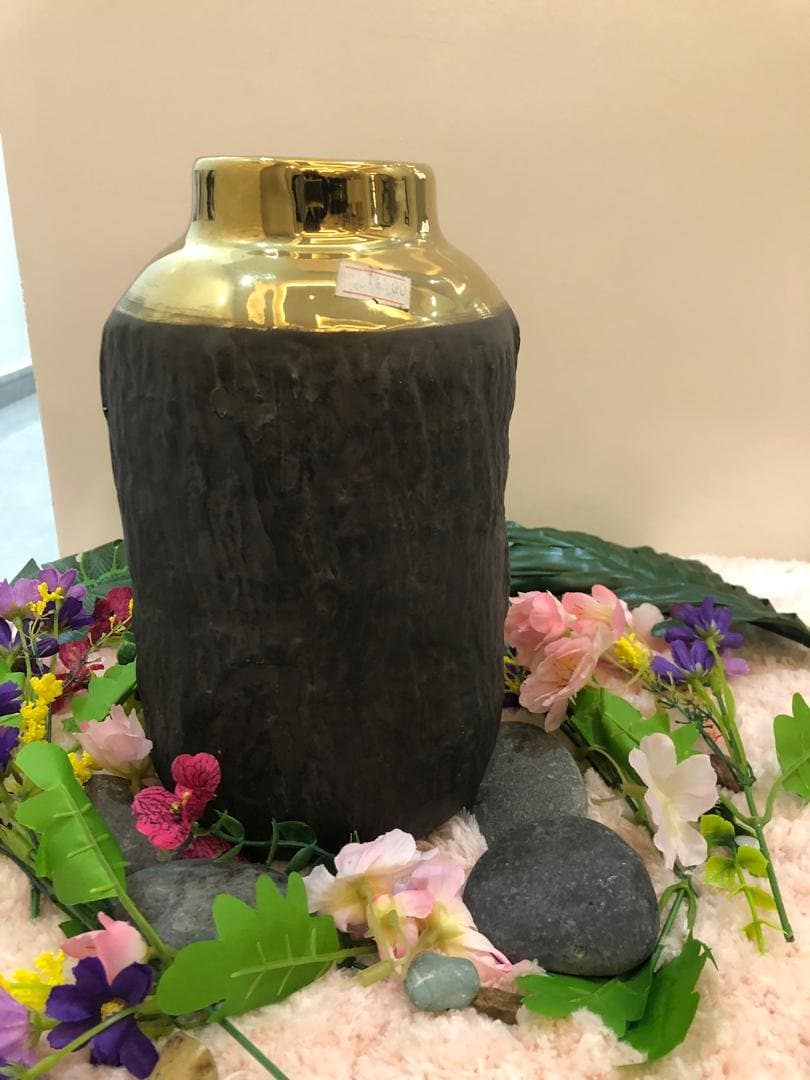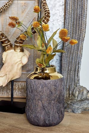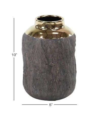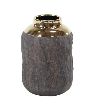 Vase décoratif en céramique avec une texture boisée naturelle et un col doré brillant. Disponible en cinq teintes modernes. Parfait pour compléter votre décoration intérieure avec une touche d’élégance.